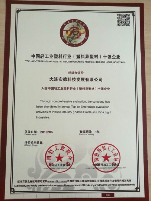 经行业协会领导及专家审查,实德科技公司被评定为“2018-2019年度中国轻工业(塑料异型材)十强企业”。