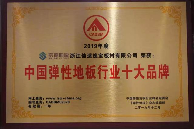 2019年12月20日,中国弹性地板协会在广东佛山召开了第三届中国全装修家居产业峰会暨弹性地板协会四届五次会员代表大会,会上公布了“中国弹性地板十大品牌”评选结果。由实德科技研究院负责组织编制申报的实德地板参评“中国弹性地板十大品牌”奖项文件,经过主管领导及评审专家的认真审查,实德地板被评选为“中国弹性地板十大品牌”称号。
